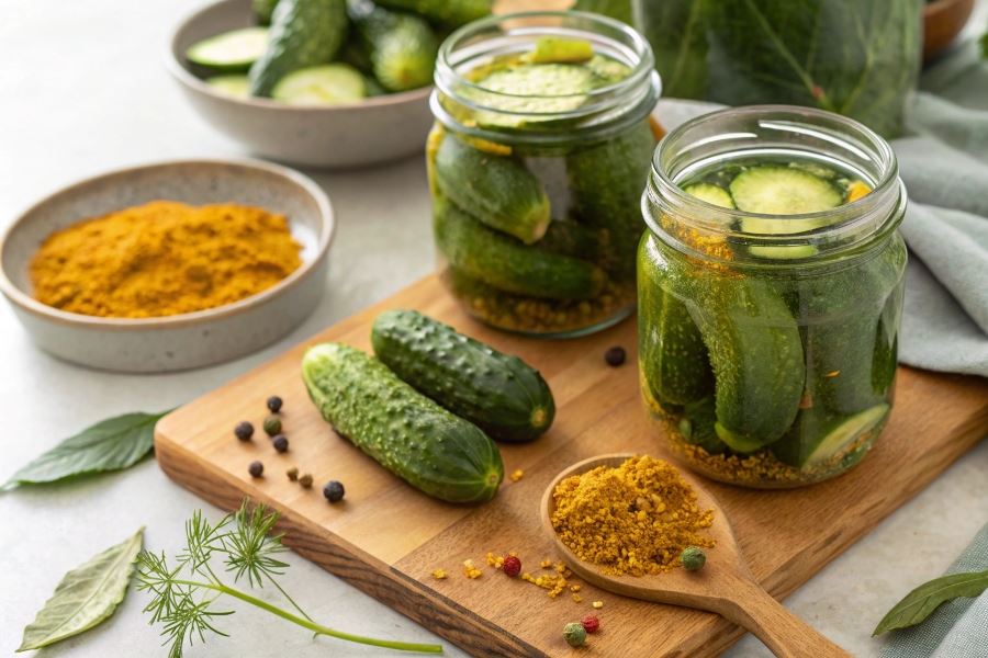 Proporcje składników na zalewę można modyfikować według własnych preferencji smakowych. Kurkuma nadaje ogórkom charakterystyczny złocisty kolor i delikatny aromat, a jednocześnie posiada właściwości konserwujące.