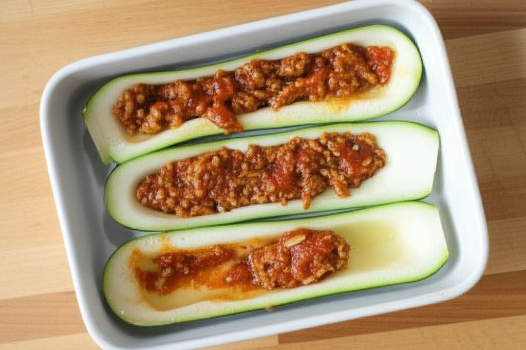 W międzyczasie przygotowujemy cukinię – myjemy ją dokładnie, odcinamy końcówki i przecinamy wzdłuż na pół. Łyżeczką delikatnie wydrążamy środek, tworząc miejsce na farsz. Wypełniamy połówki cukinii przygotowanym mięsnym sosem, posypujemy tartą mozzarellą i zapiekamy przez 10 minut w 180 stopniach.
