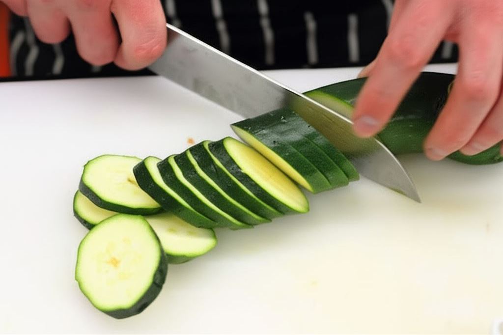 Cukinie opłucz i wraz ze skórką pokrój na plasterki. Zioła posiekaj, ser zetrzyj.