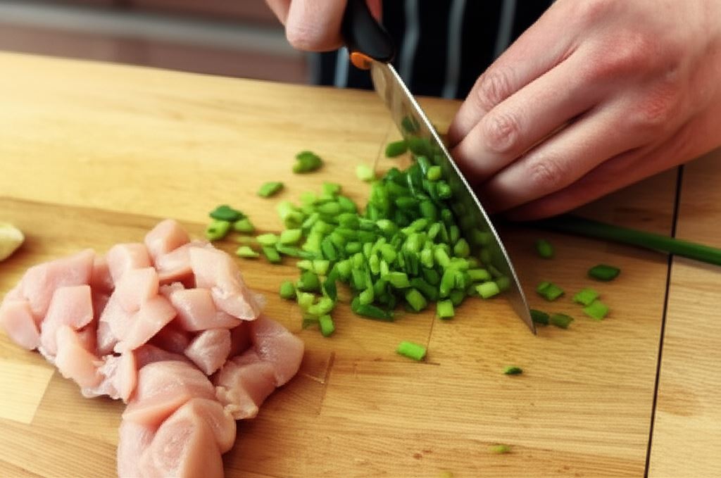 Mięso potnij w dużą kostkę, banany na połówki plasterków, a szczypiorek drobno posiekaj.