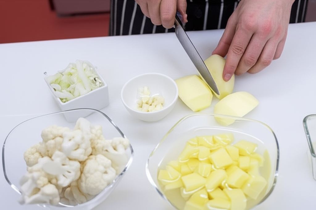 Kalafior podziel na różyczki, cebulę i czosnek posiekaj drobno, ziemniaki oraz jabłka obierz i pokrój w kostkę.