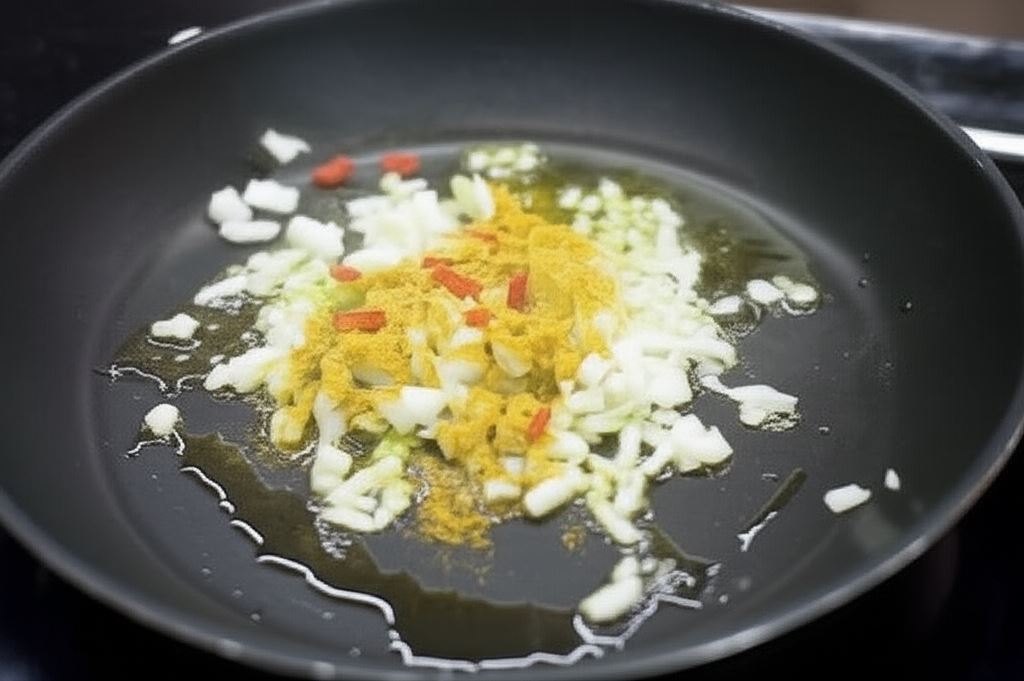 Podgrzej oliwę na głębokiej patelni i dodaj do niej cebulę, czosnek, chili i curry, po czym smaż, mieszając przez parę minut.