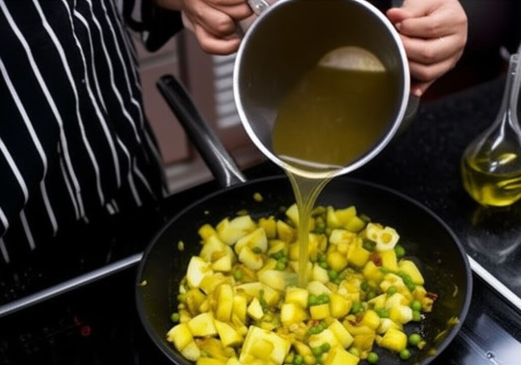 Następnie wsyp ziemniaki, jabłko, groszek i dodaj bulion. Gotuj całość na małym ogniu przez 10 minut.