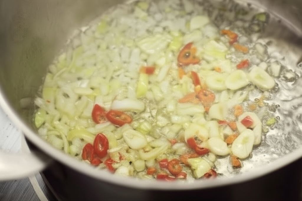 Na dużej patelni zrumień w oleju drobno posiekany czosnek, chilli i cebulę.