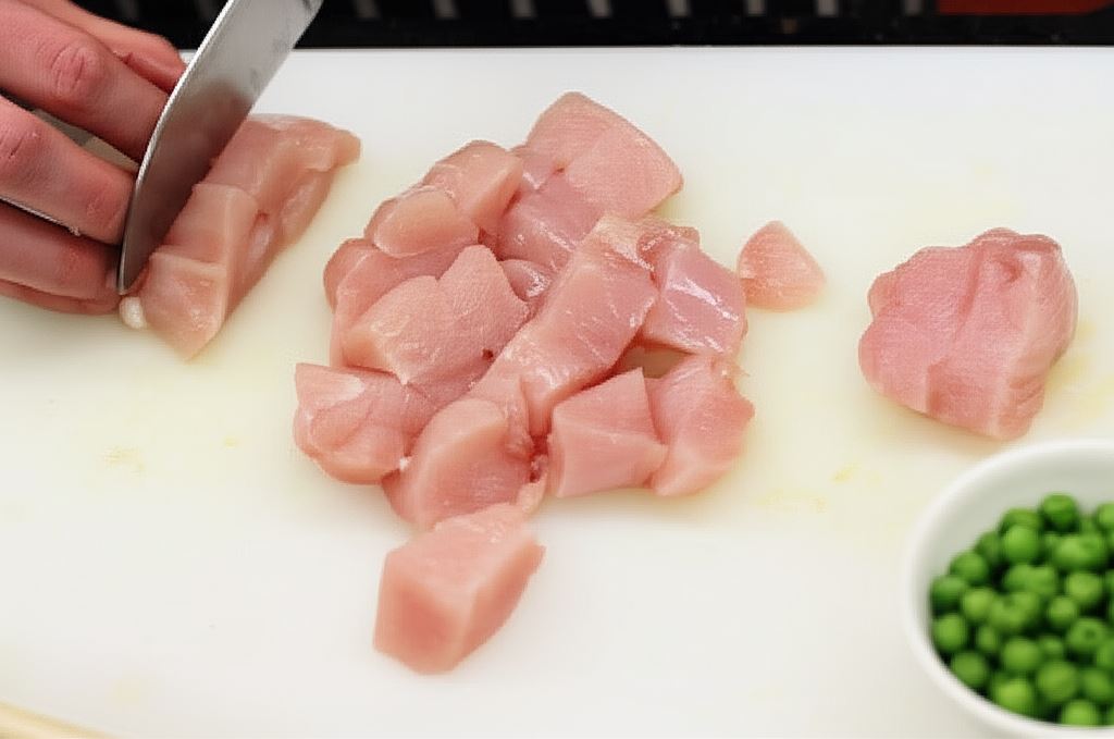 Kurczaka potnij w kostkę i razem z groszkiem dodaj do sosu.
