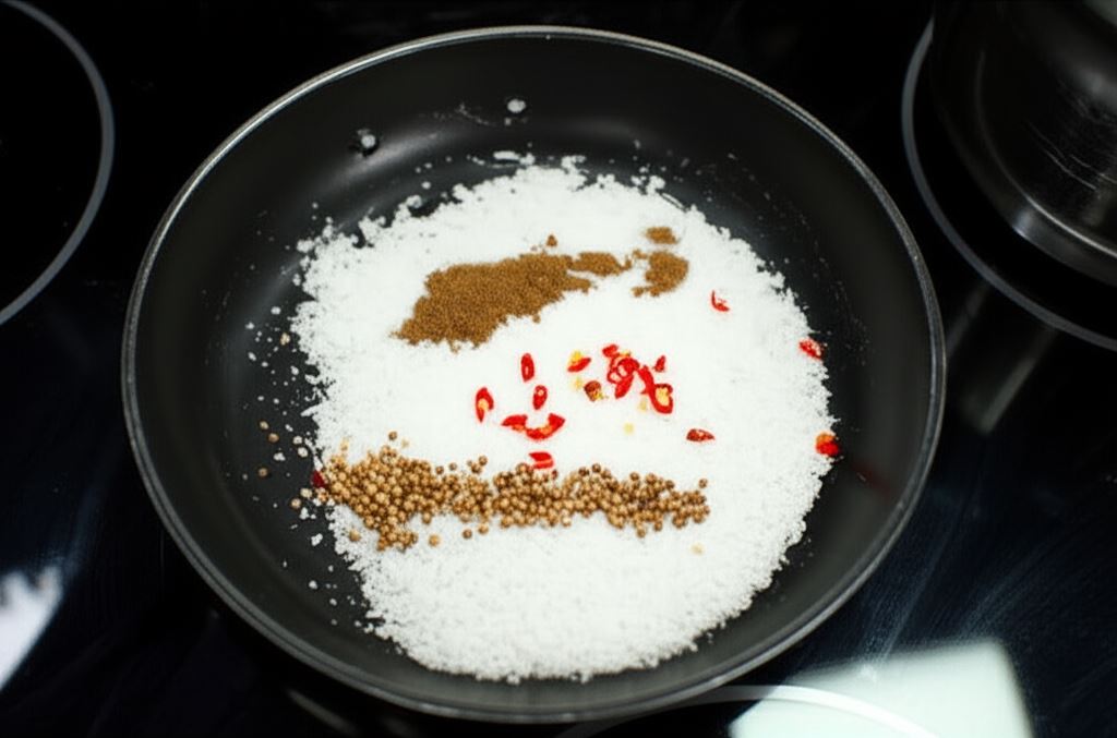 Rozpocznij przygotowanie curry z soczewicy od składników, które nadadzą mu orientalny smak. Rozgrzej na patelni olej, po czym dodaj na nią 5 łyżeczek nasion kolendry, pół łyżeczki kminu rzymskiego, papryczki chili oraz 4 łyżki wiórek kokosowych. Podgrzewaj je przez parę minut. Mieszaj, by nie przywarły do patelni. Następnie przesyp je do miski lub na talerz i odstaw do wystygnięcia.