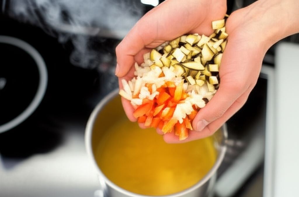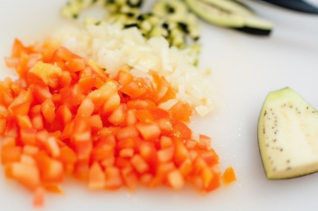Potem pokrój 4 pomidory, 2 bakłażany i 2 cebule na drobną kostkę. W tym czasie możesz zagotować wodę w garnku. Soczewicę opłucz na sicie pod wodą i wrzuć do garnka z wrzącą wodą. Dodaj do niej około ćwierć łyżeczki kurkumy i wymieszaj. Następnie dorzuć do soczewicy również kostkę Rosołu z kury Knorr i gotuj wszystko przez 15 minut.
