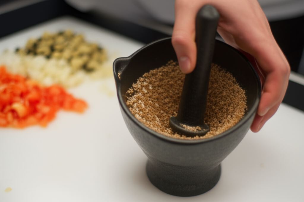 Weź moździerz. Rozetrzyj w nim uprzednio przygotowane na patelni przyprawy z kokosem.