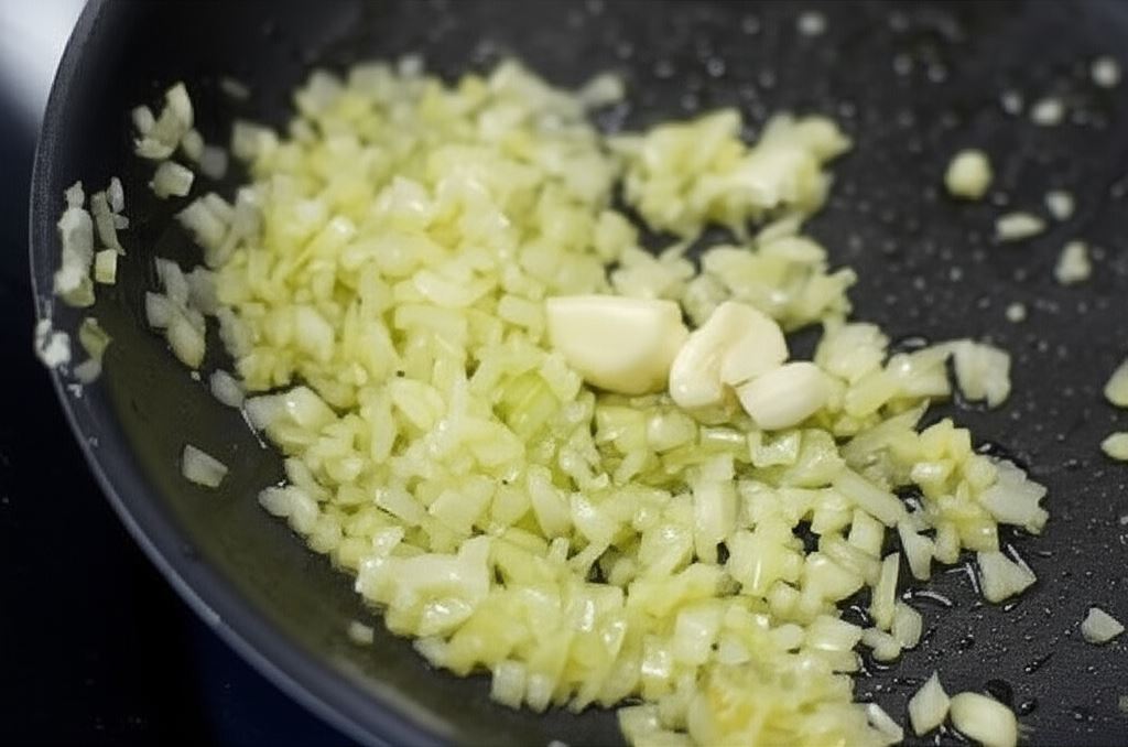 Cebule pokrój w kostkę i podsmażaj na oliwie aż się zeszkli, po czym dodaj rozgnieciony czosnek.