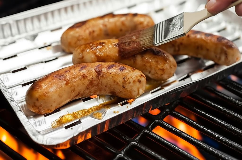 Kiełbaski piecz na średnio nagrzanym grillu, używając tacek aluminiowych. Kiełbaski regularnie pokrywaj wcześniej sporządzoną marynatą z miodu, aby skórka kiełbasy stała się rumiana i chrupiąca.