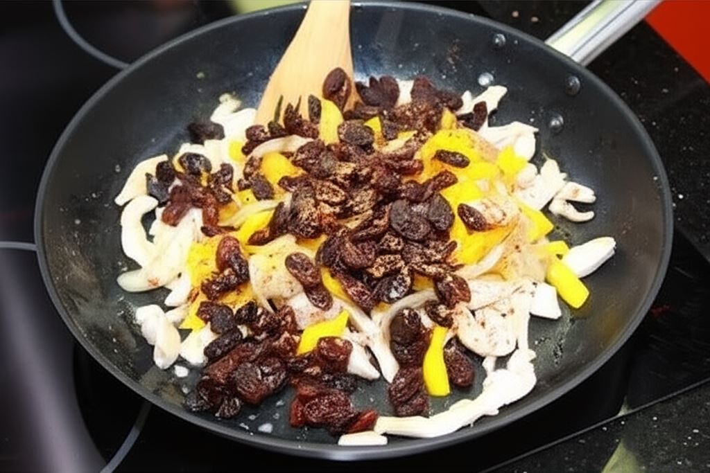 Wrzuć mięso, rodzynki i paprykę. Potem przypraw solą, pieprzem, cynamonem oraz kolendrą. Rozpuść kostki Bulionu na włoszczyźnie Knorr w 0,5 litra wody.