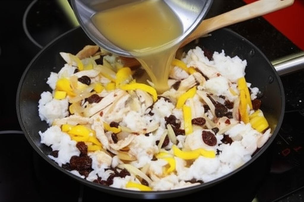 Do mięsa z warzywami dodaj ryż i smaż przez 1 minutę, stale mieszając. Następnie wlej rosół, przykryj pokrywką i duś całość na małym ogniu przez 15 minut.
