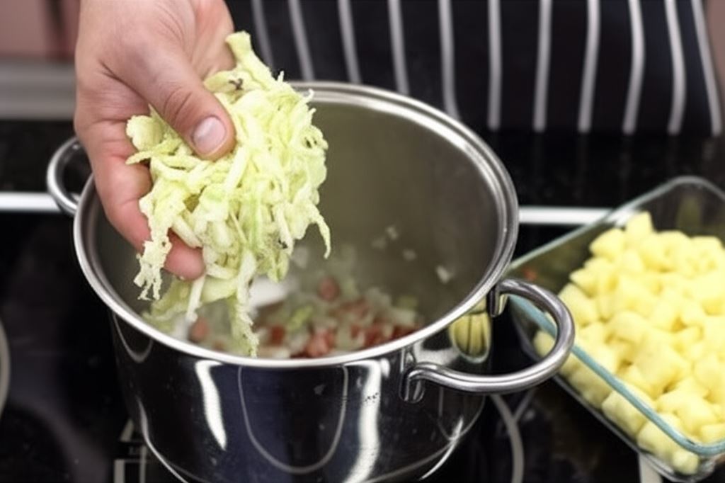 W rondlu zrumień pokrojone w kostkę boczek i cebulę. Wsyp posiekaną kapustę i wszystko krótko przesmaż. Potem dodaj pokrojone w kostkę ziemniaki.