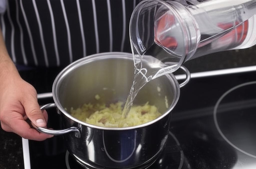 Zalej wszystko 800 ml zimnej wody i gotuj do momentu, aż ziemniaki zmiękną.