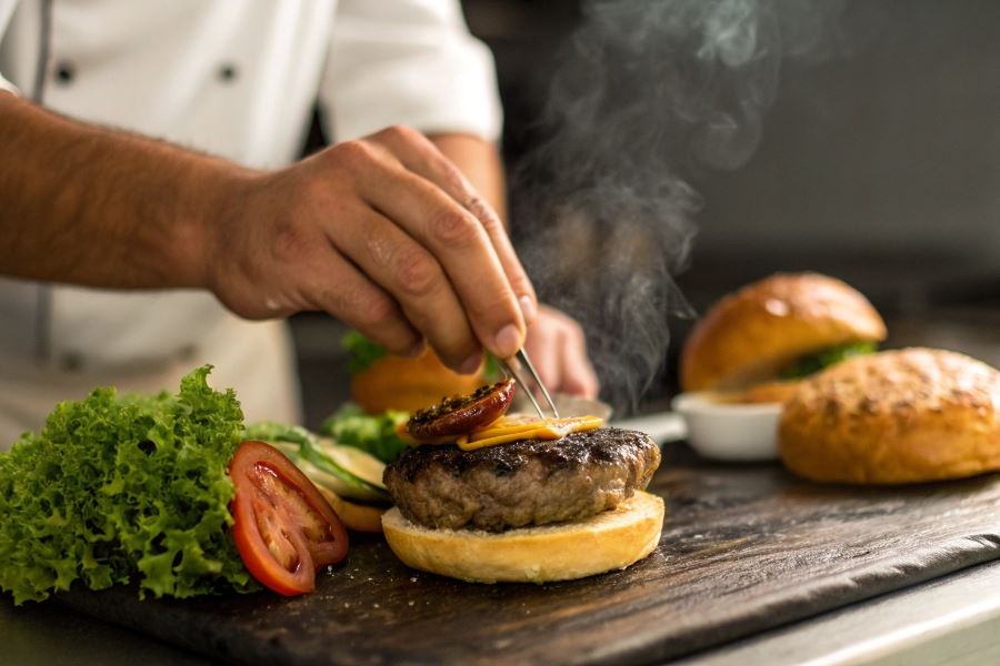 Przygotowanie burgera zaczyna się od odpowiedniego formowania kotleta – mięso nie powinno być zbyt mocno ugniecione, co zapobiega jego twardnieniu podczas smażenia. Warto wykonać wgłębienie w środku kotleta, aby zapobiec jego wybrzuszaniu się podczas obróbki termicznej.