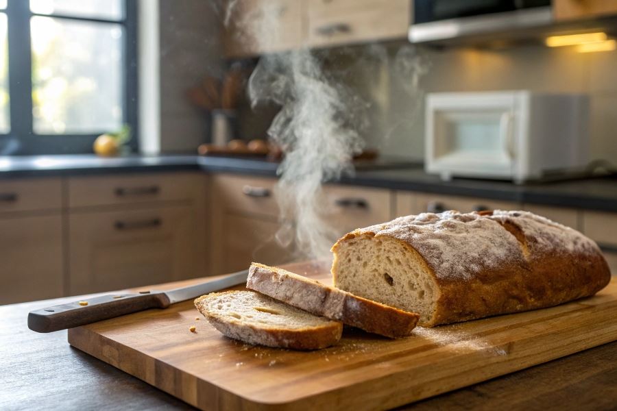 Metoda nawilżania: Umieść obok chleba w mikrofalówce małą miseczkę z wodą. Powstająca para nawilży pieczywo podczas rozmrażania, zapobiegając wysuszeniu.