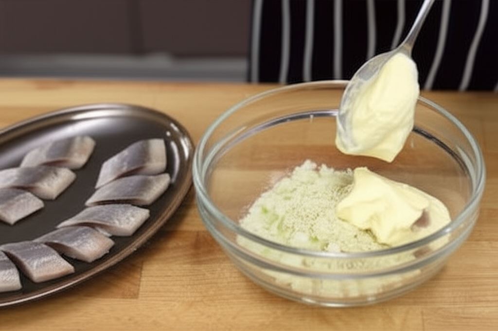Pokryj warstwą kremowego sosu majonezowego śledzie, aby całkowicie je zasłonić. Przed serwowaniem ochłodź śledzie w lodówce przez godzinę.