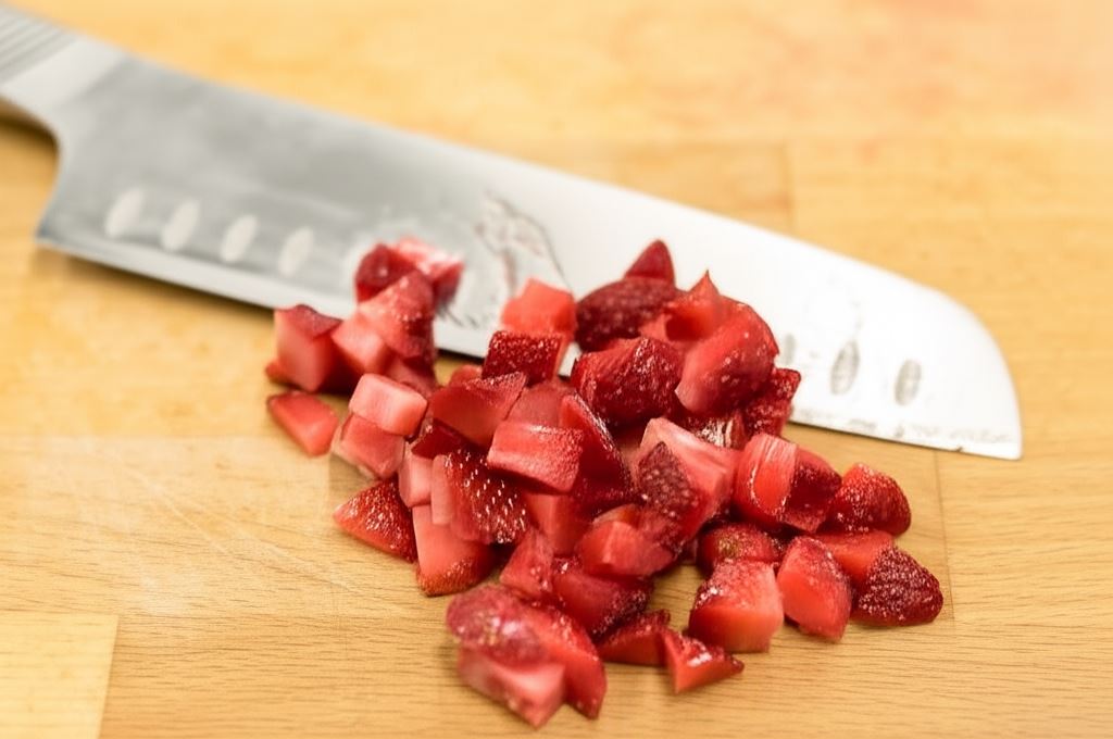 Jedną połowę truskawek pokrój w plasterki albo kosteczkę. Drugą część zblenduj na mus w blenderze.