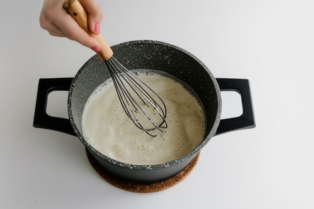 Po chwili stopniowo wsypujemy kaszę mannę nieustannie mieszając, aby zapobiec tworzeniu się grudek. Gotujemy przez kilka minut, dopóki masa nie stanie się gęsta i przejrzysta.