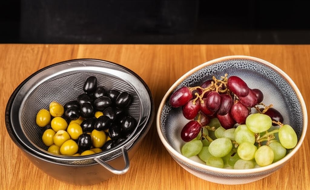 Winogrona opłucz, rozdziel na mniejsze grona, oliwki odsącz.