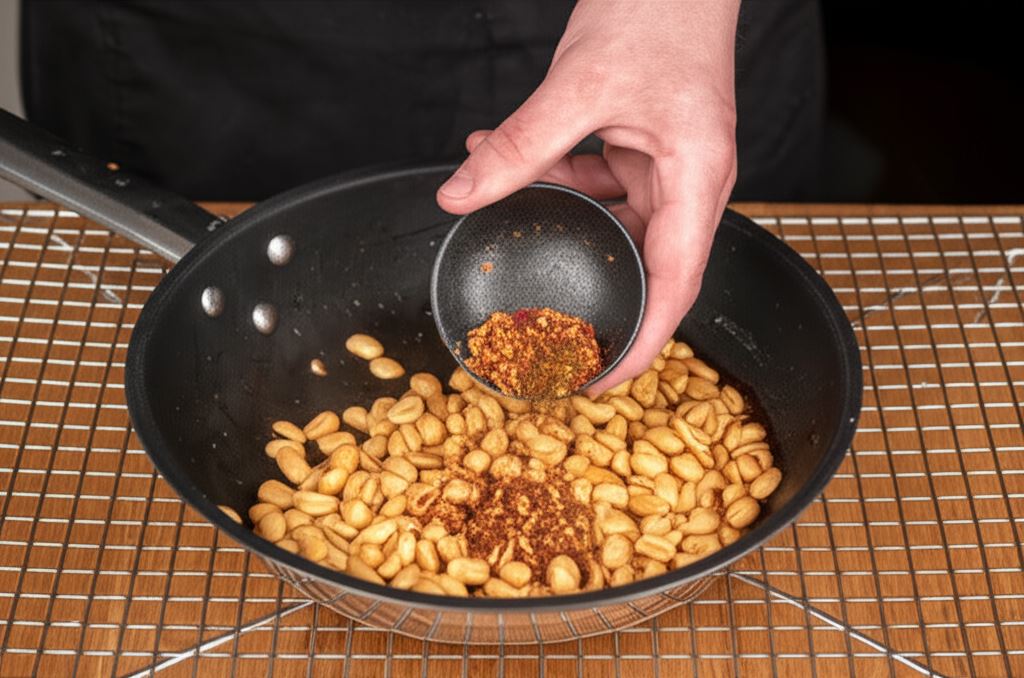 Wsyp cukier na patelnię i podgrzewaj aż powstanie bursztynowy karmel, potem dodaj wodę, orzechy oraz przyprawę Knorr. Dokładnie wymieszaj i gotuj przez 2 min.