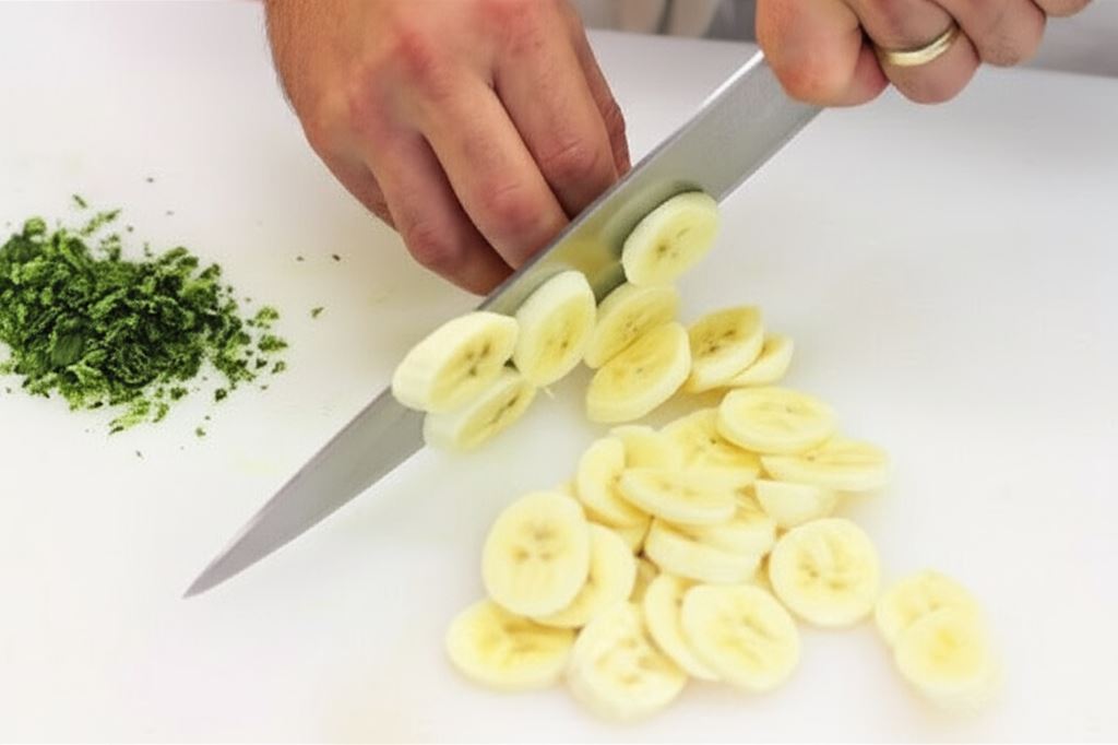 Posiekaj natkę pietruszki. Banany obierz i pokrój na plastry.
