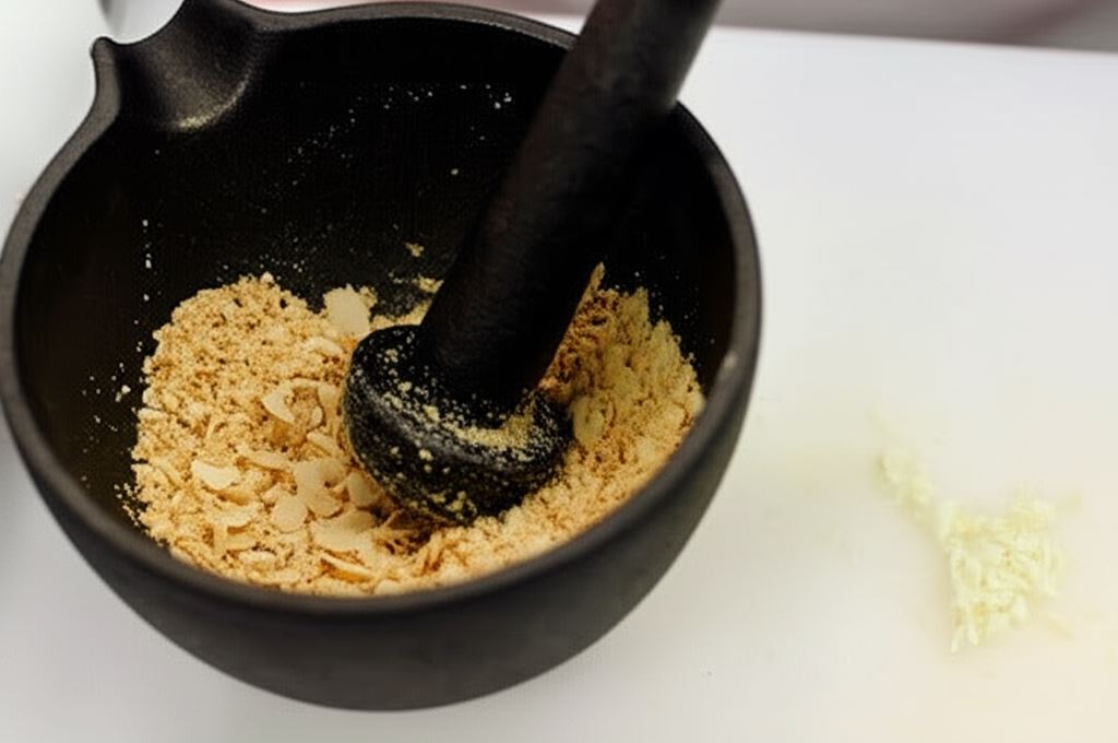 Migdały zrumień na patelni i roztłucz w moździerzu. Czosnek drobno posiekaj.