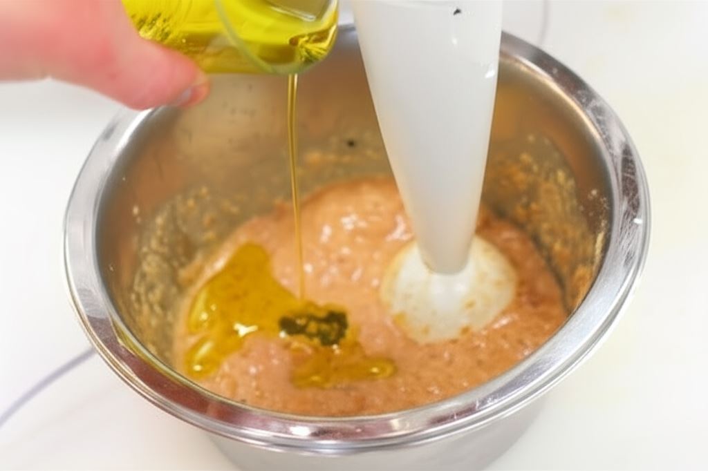 Wlewaj stopniowo po łyżeczce oliwy. Ochłódź i serwuj.