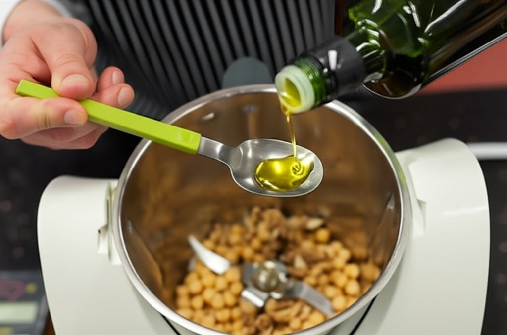 W naczyniu blendera zmiksuj odcedzoną ciecierzycę z oliwą oraz orzechami włoskimi.