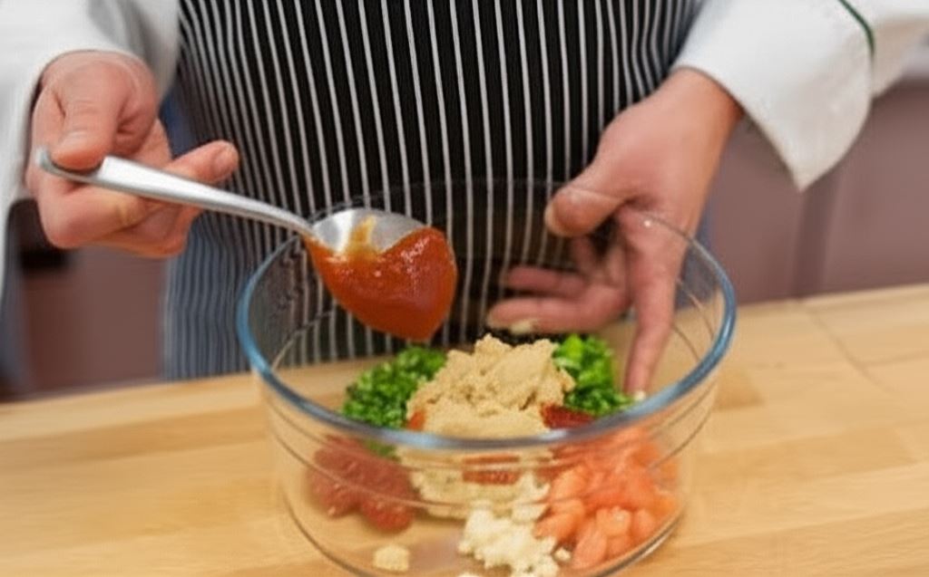 Uzyskaną masę przenieś do miseczki i wsyp pokrojone na drobne kawałki pomidory, ketchup Hellmann's, posiekaną dymkę wraz z cebulą i szczypiorem, natkę kolendry, rozgnieciony czosnek, sok z limonki oraz pastę harisa.