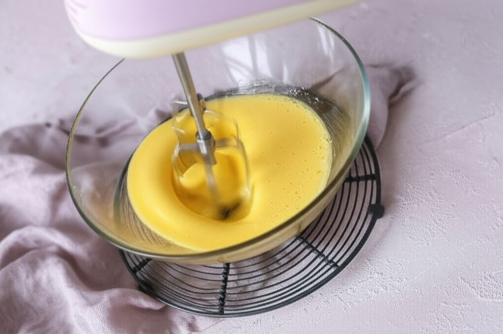 Żółtka i jajko ubij z resztą cukru (2 łyżkami) aż powstanie jasna, puszysta masa.