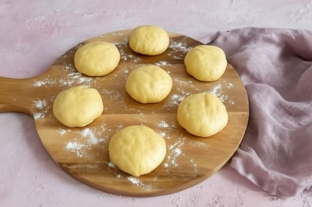Wyrośnięte ciasto odgazuj, przez moment wygniataj i rozdziel na ok. 14 kulek. Delikatnie spłaszcz, nakryj i pozostaw do ponownego wyrośnięcia na ok. 30 minut.