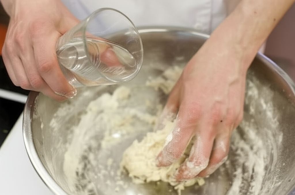 Potem stopniowo dodawaj wodę i wyrabiaj ciasto. Gotowe nakryj ściereczką i odstaw na parę minut.