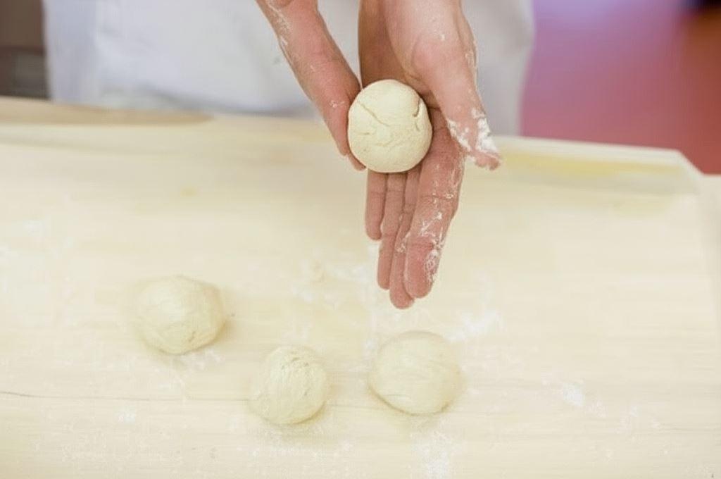 Podziel ciasto na porcje i uformuj z nich kulki. Każdą kulkę rozwałkuj na cienki placek na stolnicy oprószonej mąką.