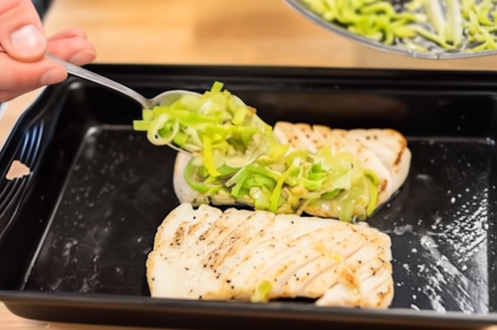 Umieść rybę na blasze, ułóż na niej przygotowany por.
