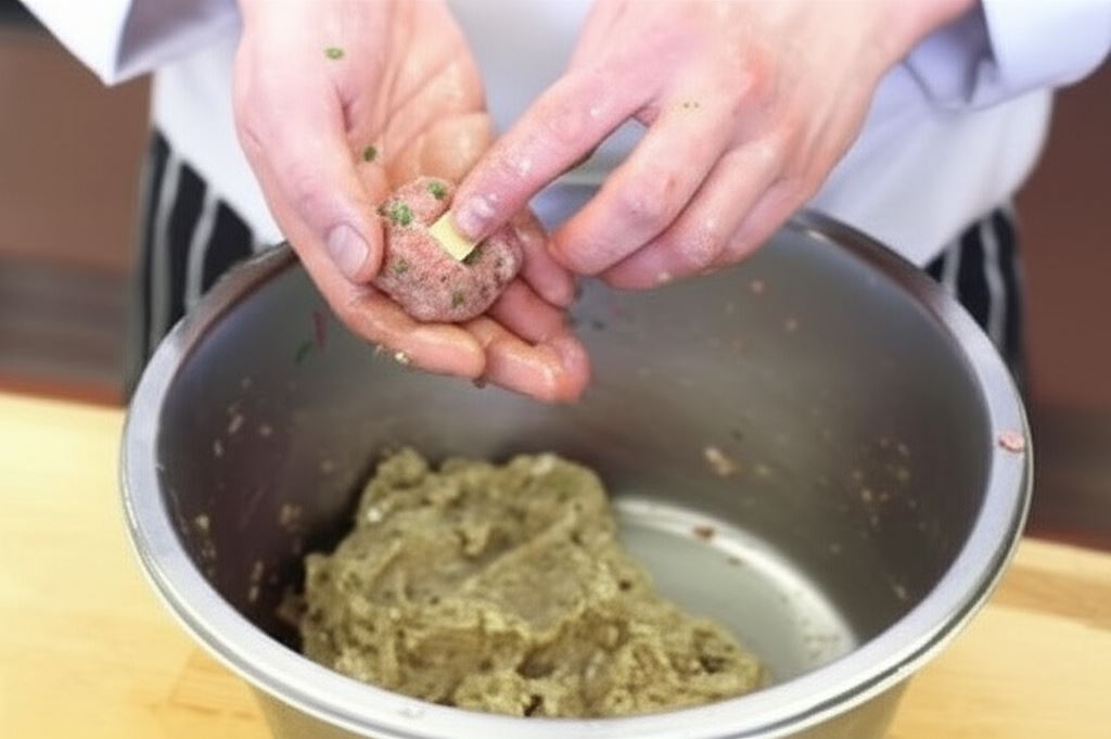 Uformuj niewielkie kuleczki, wkładając do każdej kawałek żółtego sera.