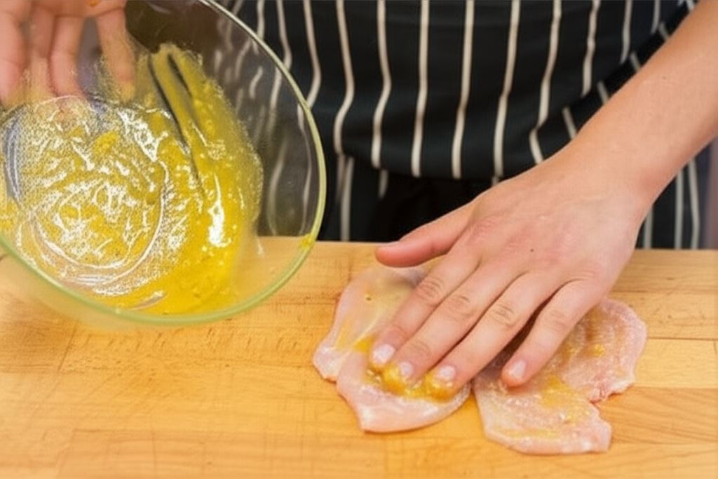 Piersi opłucz i osusz, potem przekrój każdą na pół wzdłuż, uzyskując dwa cienkie płaty. Każdy płat delikatnie rozbij tłuczkiem. By mięso nie uległo rozerwaniu, umieść je pomiędzy dwoma arkuszami folii spożywczej.