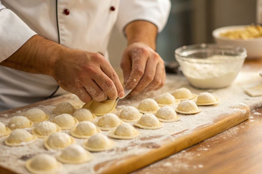Innowacyjne podejście do formowania pielmieni z ciasta budyniowego wprowadza technikę podwójnego składania, która zwiększa wytrzymałość ciasta podczas gotowania przy zachowaniu jego delikatności. Polega ona na złożeniu ciasta na pół przed wycinaniem krążków, co tworzy mikroskopijne kieszenie powietrzne zwiększające elastyczność.
