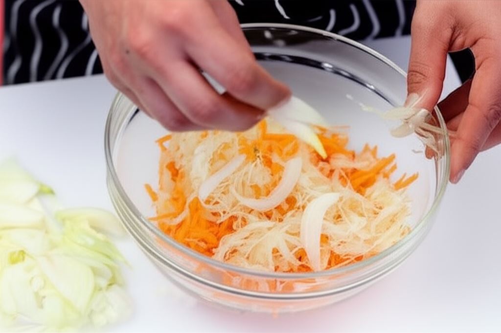 Przepłukaną kapustę kiszoną połącz z obraną i startą na grubych oczkach marchewką oraz z cebulą pokrojoną w piórka.