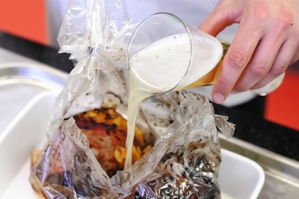 Rękaw umieść w naczyniu żaroodpornym. Piecz 90 minut w temperaturze 200 °C. Po upływie tego czasu przetnij rękaw i skrop golonki piwem. Piecz 20 minut w 180 °C.