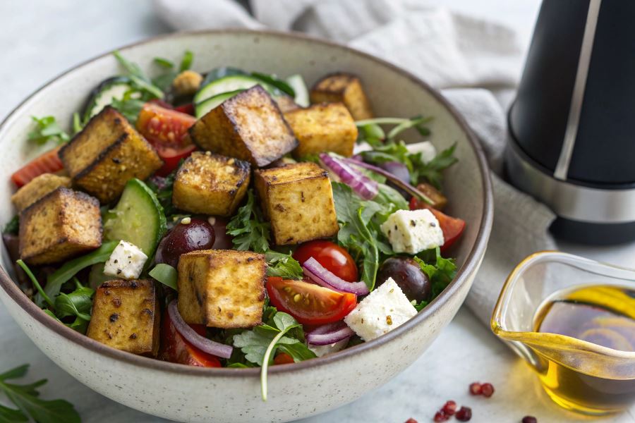 Airfryer pozwala przygotować idealnie miękki bakłażan do ciepłych, sycących sałatek. Bakłażana pokrój w kostkę, skrop oliwą z dodatkiem kuminu i pieprzu, piecz w 200°C przez 15 minut. Odsączoną ciecierzycę wymieszaj z oliwą, solą i papryką, a następnie umieść w airfryer na 10 minut w temperaturze 180°C. Połącz upieczone składniki z rukolą, posiekaną natką pietruszki i czerwoną cebulą. Całość polej sosem z tahini, soku z cytryny, czosnku i odrobiny wody. Podawaj natychmiast po przygotowaniu, gdy bakłażan i ciecierzyca są jeszcze ciepłe.