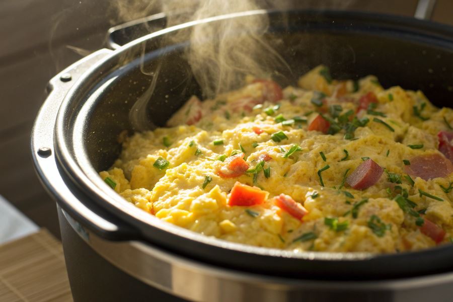 Jajecznica z dodatkami mięsnymi wymaga dwuetapowego przygotowania w multicookerze: