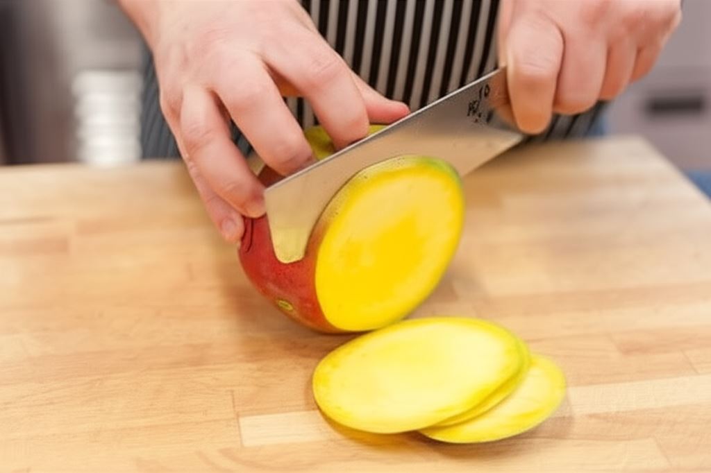 Owoce opłucz. Mango potnij w plastry, które utworzą skrzydła motyla. Potem rozłóż je na talerzu.
