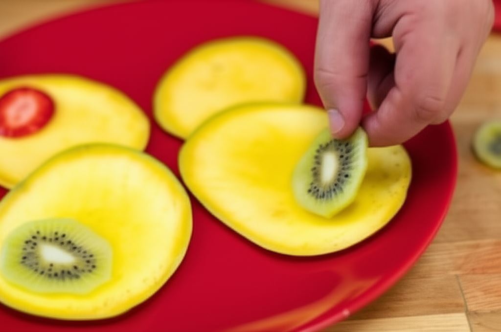 Pokrój truskawkę i kiwi w plastry, a następnie ułóż je na skrzydłach motyla.