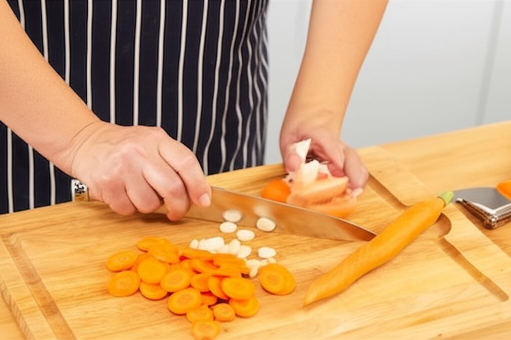 Przygotuj makaron zgodnie z instrukcją na opakowaniu. Obierz i pokrój marchewkę oraz pietruszkę w plasterki.