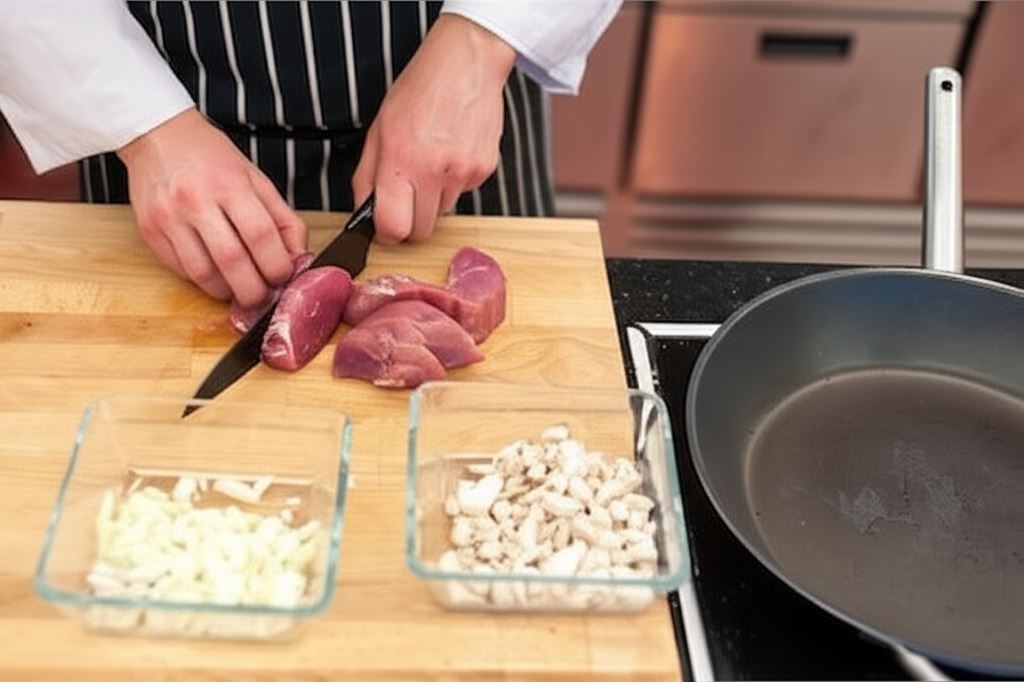 Potnij mięso na grube plastry, a pieczarki i cebulę pokrój w kostkę.