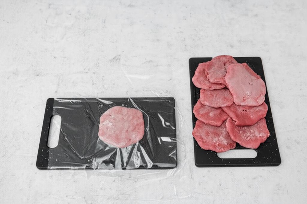 Mięso potnij na grube plastry o grubości 1,5cm, ubij tłuczkiem przez folię, posyp solą i pieprzem. Mięso zegnij na połowę i ponownie delikatnie uderzając tłuczkiem nadaj mu względnie okrągły kształt.