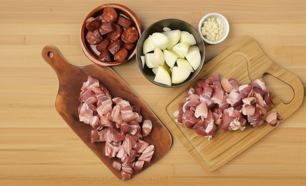Golonkę oczyść od kości (zostaw do gotowania) i potnij na duże kawałki. Kiełbasę i boczek pokrój na grube plastry. Cebule podziel na 8 części, a czosnek drobno posiekaj.