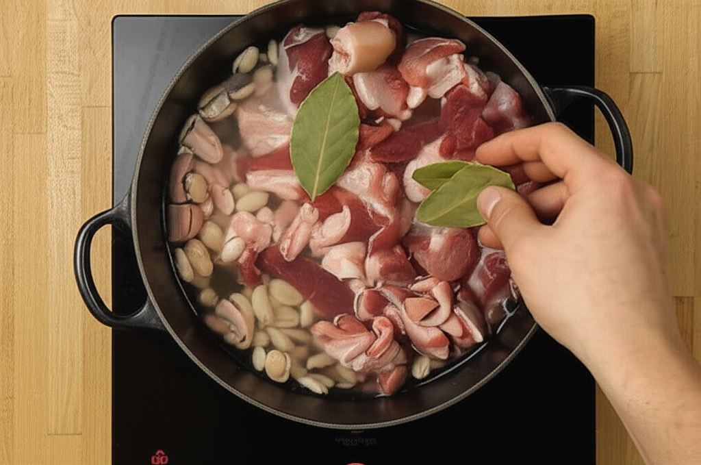 W garnku żeliwnym z grubym dnem umieść fasolę z mięsem i kością golonkową, wsyp liście laurowe Knorr i gotuj przykrytym przez około 60 min.