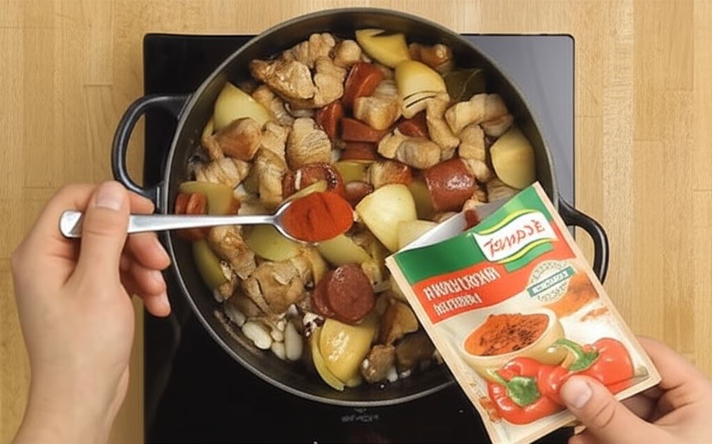 Na patelni zrumień boczek, chorizo i cebulę, przenieś do garnka z fasolą, wsyp szafran, słodką paprykę Knorr i posiekany czosnek. Wlej szklankę wody i gotuj przez 30 minut, dopóki mięso i fasola nie zaczną się rozpadać.